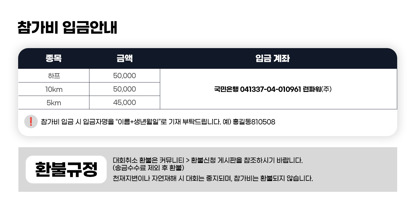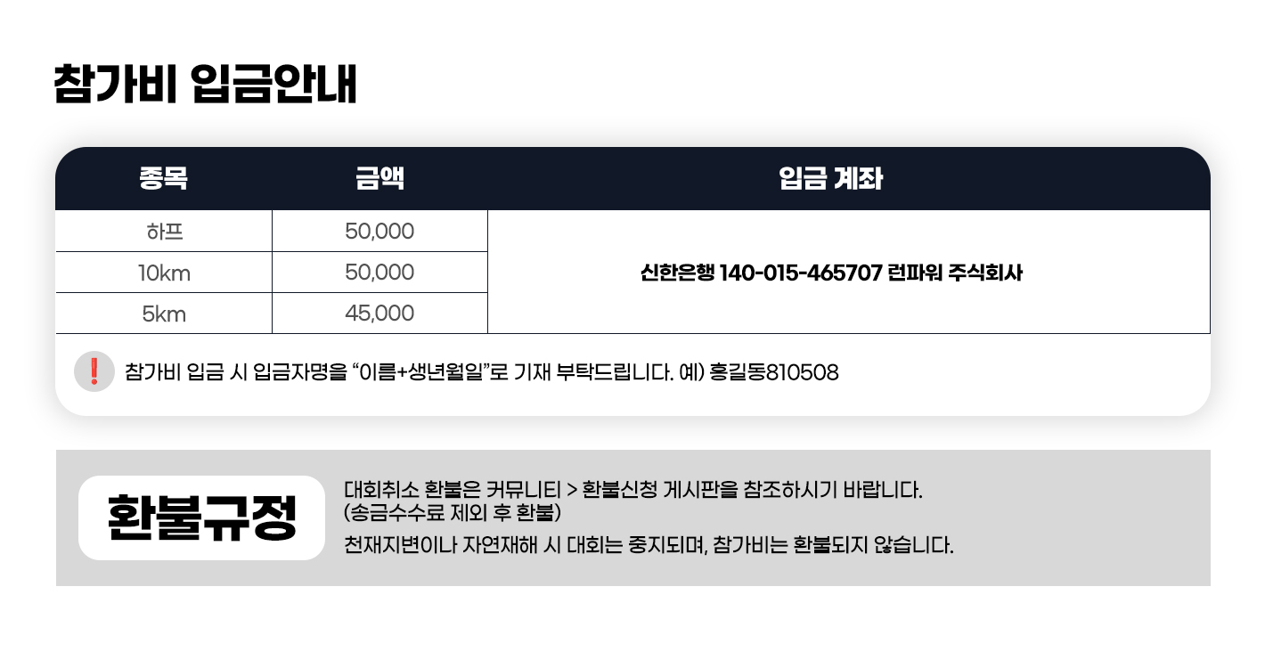 천재지변이나 자연재해시 대회는 중지되며, 참가비는 환불되지 않습니다.