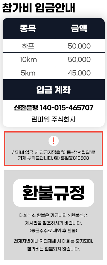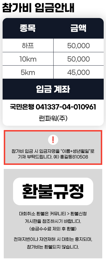 참가비 입금 시 입금자명을 "이름+생년월일" 로 기재 부탁드립니다. 예) 홍길동810508